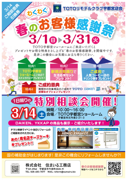 TOTO リモデルクラブ宇都宮店会 『わくわく 春のお客様感謝祭』 開催中!! 3/14(土)は1日限りの特別相談会 開催日(^^)/ 来場された方へは、あの、有名店のチーズケーキのプレゼントもありますよ♡