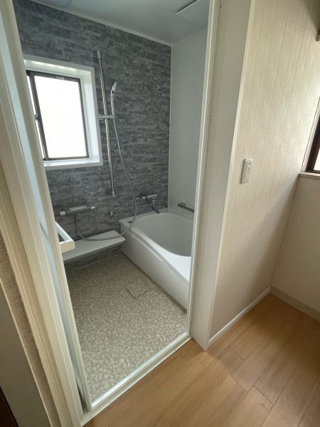 これにより、お湯が冷めにくく、浴室全体の保温性が向上し、ヒートショックのリスクを軽減しています。また、脱衣室も内装を全て一新し、デザイン性の高い新しい洗面化粧台に交換することで、収納スペースを確保するための棚も設置し、タオルや着替えの整理がしやすくなりました。
