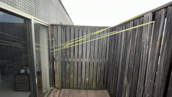 2階の既存ベランダに屋根を新設し、実用性を高めたリフォーム事例です。3階の木の塀が突風で金物が外れ落ちそうになっており、応急処置としてナイロンテープで抑えてありました。