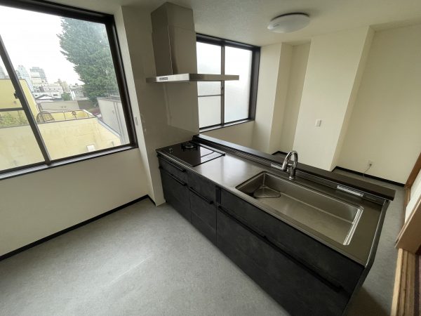 二つ目に紹介するのが、システムキッチンの施工事例です。こちらの事例は壁付きキッチンから対面式への移設を行った例です。3階にあるキッチンという条件下で、換気ダクトや給排水配管の位置変更といった設備まわりの工事が主なポイントでした。