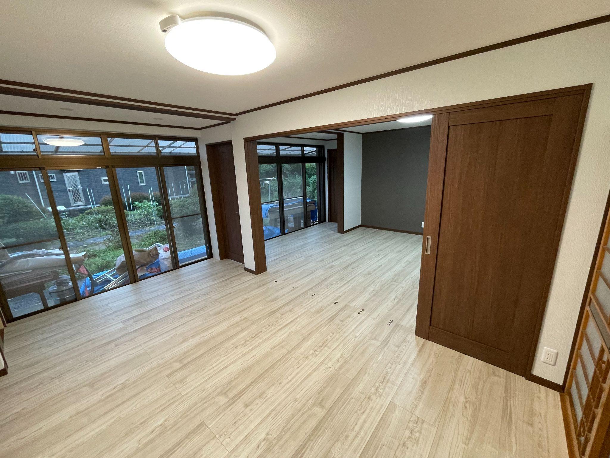 三つ目は、和室2間と縁側を一体の洋室リビングとして活用した大規模な工事例です。8畳と6畳の和室、段差のある縁側をフラットにつなげ、一続きのLDK空間へと改修しています。段差解消や建具の変更など、細かな調整を行いながら施工を進めました。