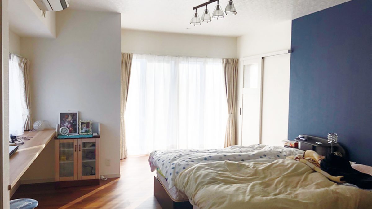 今回工事を予定している場所は、2部屋続きの床の間付きの和室と広縁の間取りを替て、主寝室から直接行ける多目的トイレの新設と、いままで利用頻度が低かった広縁をサニタリールームに用途替えをいたしました。建具類は手作り感のある白色に統一し、枕元の壁は藍色のアクセントクロスでフェミニンで大人可愛く仕上がりました。